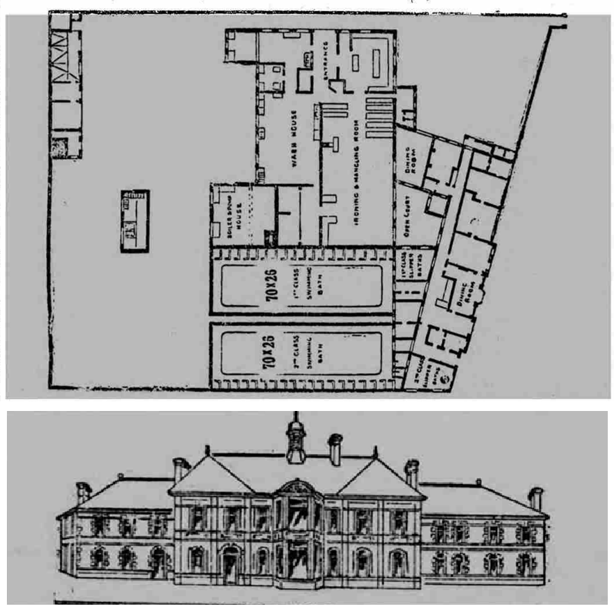 The baths included two large salt-water swimming pools, each around 70 feet long and 25 feet wide, divided into first- and second-class baths with separate entrances and changing accommodation. Alongside the swimming baths were Turkish baths, vapour rooms, plunge baths and cold baths, arranged so that bathers could move through them in sequence.