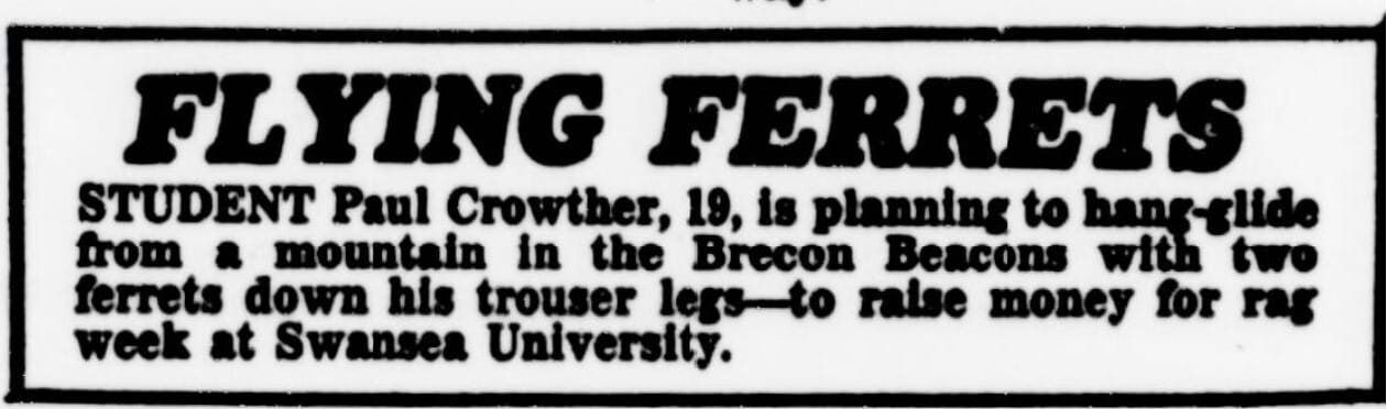 In 1984, Student Paul Crowther, 19, told the Evening Post about his plans to raise cash for RAG week by hang-gliding from a mountain in the Brecon Beacons with two ferrets down his trouser legs. Are you out there, Paul? Did you do it? Did the ferrets put you up to it?