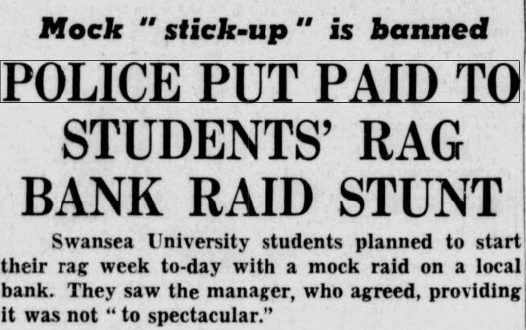 In 1959, Swansea students planned an ambitious stunt to kick off RAG Week with a bang — a mock bank robbery. While the bank manager gave his tentative approval, provided the stunt was “not too spectacular,” the response from the police was a swift and unequivocal “No,” citing concerns about public confusion and potential panic.