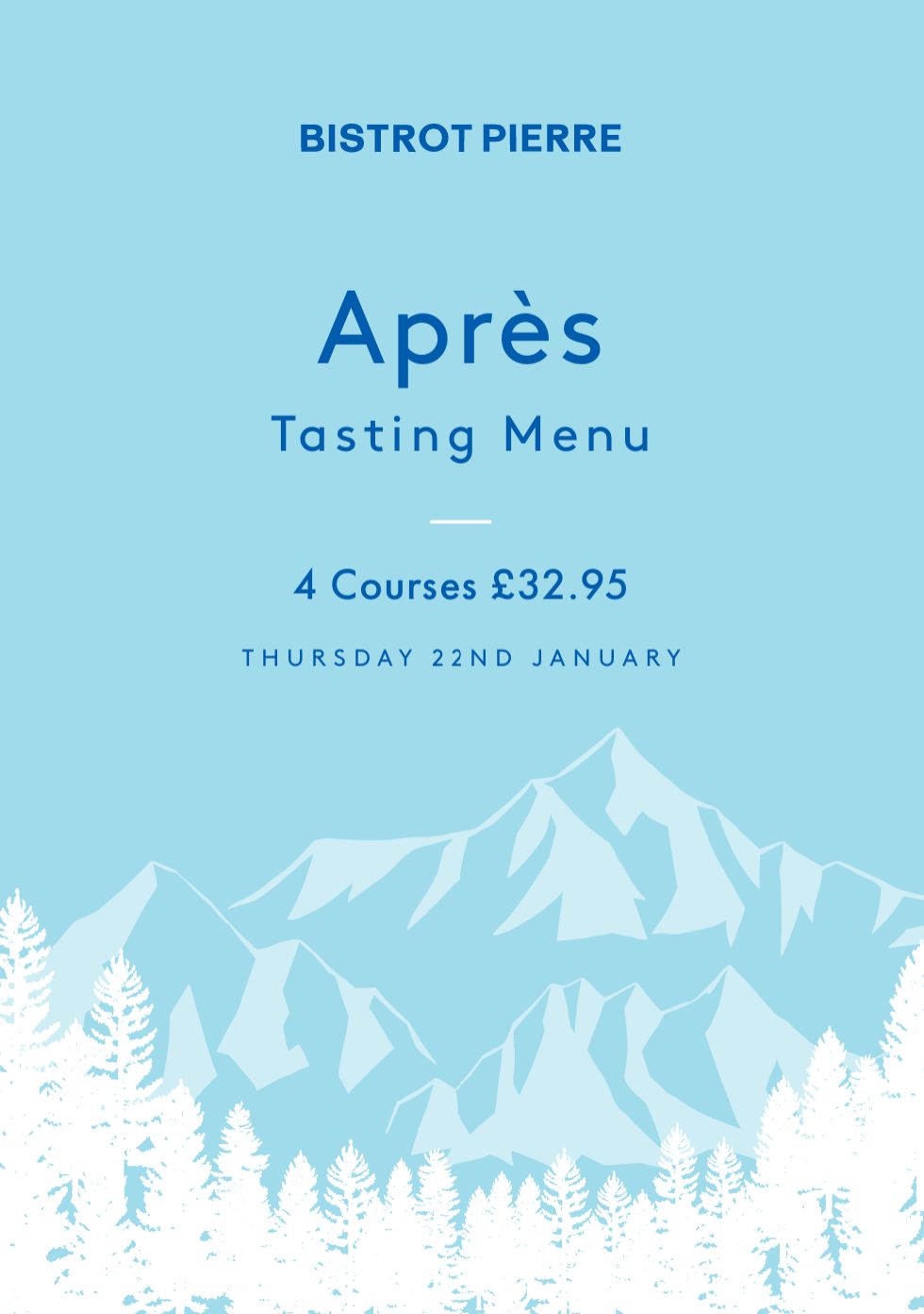 For one night only on Thursday 22nd January from 5pm onwards, we’re bringing the magic of the French alps to you. Enjoy 4 courses of delicious winter favourites for just £32.95 per person.
